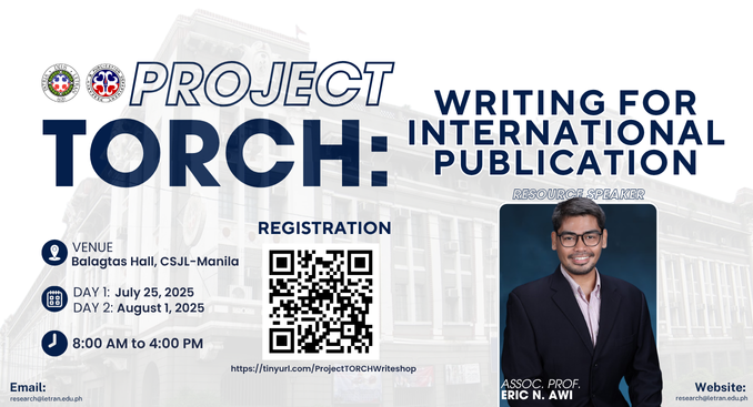The Research and Publication Department invites you to Project TORCH: Research Writeshop – Writing for International Publication, happening on July 25 and August 1, 2025 (Fridays), from 8:00 AM to 4:00 PM at Balagtas Hall.